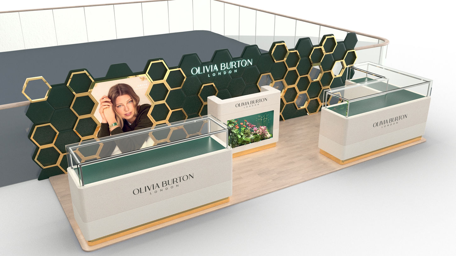 design a retail kiosk for Olivia Burton, celebrating the new evergreen honeycomb pattern.